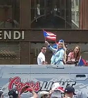 Organizers of the 2017 parade chose to honor Oscar López Rivera, considered a terrorist by some[19] and a freedom fighter by others.[20][21] As a result of López Rivera being selected, parade sponsors Goya Foods,[22] JetBlue,[23] Coca-Cola,[23] AT&T,[22] and the New York Yankees[24] dropped their sponsorship. New York City Police Department's Hispanic Society[24] did not march, as well as NYPD's Gay Officer Action League and NYPD Police Commissioner James O'Neill. Some artists, such as Puerto Rican salsa singer Willie Colón criticized the parade organizers as having gone too far,[25] while others, such as six-time Grammy Award-winning Puerto Rican salsa singer Gilberto Santa Rosa, chose to participate.[26][23][22] Despite the controversy, the 60th Parade was celebrated on 12 June 2017.[27][28] New York City mayor Bill de Blasio also participated greeting attendees and shaking hands.[29] After public and corporate backlash, Mayor De Blasio had announced that López Rivera would not be honored at the 2017 parade[30] but, in the end, the Puerto Rican activist was honored and kicked off the Parade celebration.[31][32] López Rivera said he wished to keep the focus on Puerto Rico rather than himself.[33]