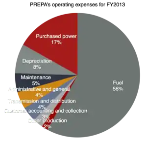 As of 2014 the authority carries liabilities of US$10.1 billion against assets of $6 billion.[61] It also operates with a deficit of about $354 million against revenues of $4.8 billion.[62][63] In terms of costs, $2.6 billion or about 58% of PREPA's expenses are attributed to fuel purchases alone while salaries and collective bargains represent less than 13% of the authority's expenses.[63]