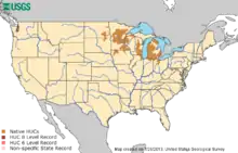The pugnose shiner is a non-abundant species of Notropis and within the United States, it is distributed across parts of Minnesota, Wisconsin, and Michigan. It is native to North America and its historic range was from eastern Ontario and Western New York to North Dakota, Illinois, Indiana, and Ohio, ending in the St. Lawrence River drainage.[3] The population that was once in North Dakota is now thought to be extirpated due to turbidity and uprooted vegetation within the freshwater lakes and streams. This minnow can also be found in a few areas of Canada but those ranges have also decreased throughout time so now the Canadian population mostly lies within Ontario.[1]