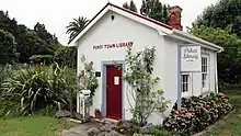 The Puhoi Town Library, one of the smallest in New Zealand, was established in 1923 in what was originally the Districts Road Board Office (built 1913).[9] In the "Great Flood" of 1924 it was filled with 6 ft of silt, and its contents destroyed – the water level is marked on the building. The library was not re-established until 1977.[10] It was flooded again in 2001. It contains over 4000 books and 500 DVDs and is staffed by a single volunteer librarian.