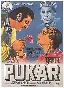 Pukar (Urdu: پُکار) is a 1939 Urdu film produced and directed by Sohrab Modi at the production house, Minerva Movietone. The film is about Mughal emperor Jehangir's legendary justice and his inner conflict when his wife kills an innocent citizen by mistake.