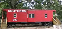 A real Norfolk Southern Railway 380 bay window red caboose with a Southern Railway paint scheme is displayed in the park for children to explore.[11]