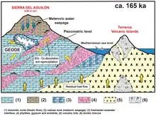 The latest scientific research, on the origin of the geode, was published on 23 March 2022; the research was led by Fernando Gázquez of the University of Almeria, with the conclusion that the gypsum crystals were formed between 164 ± 15 thousand and 60 thousand years ago, in the upper Pleistocene, from a freshwater aquifer (with very little evidence of brackish or sea water, as suggested previously).[5]