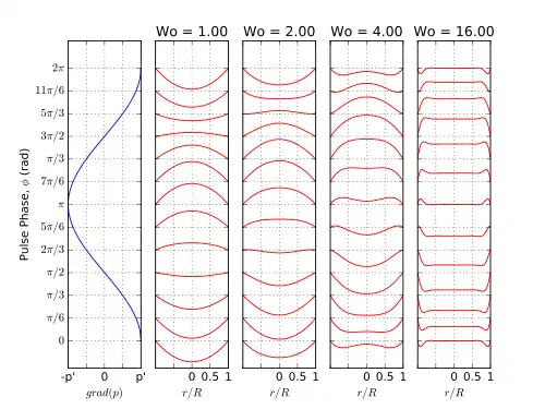 This is highly reminiscent of the Stokes layer on an oscillating flat plate, or the skin-depth penetration of an alternating magnetic field into an electrical conductor. On the surface , but the exponential term becomes negligible once becomes large, the velocity profile becomes almost constant and independent of the viscosity. Thus, the flow simply oscillates as a plug profile in time according to the pressure gradient,