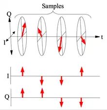 The local oscillator is split into two signals that are offset by 90 degrees, and each is mixed with the received signal. This mixing produces I(t) and Q(t). Phase coherence of the transmit signal is crucial for pulse-Doppler operation. In the diagram, the top shows phases of the wave-front in I/Q.
