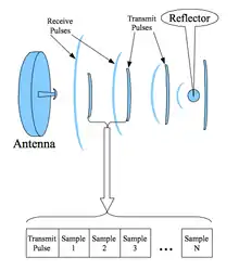 Pulse Doppler radar may have 50 or more pulses between the radar and the reflector.