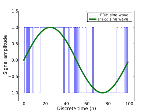A run consisting of all 1s would correspond to the maximum (positive) amplitude value, all 0s would correspond to the minimum (negative) amplitude value, and alternating 1s and 0s would correspond to a zero amplitude value. The continuous amplitude waveform is recovered by low-pass filtering the bipolar PDM bitstream.