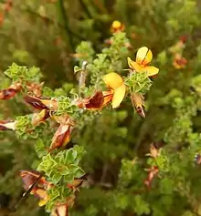 Pultenaea densifolia, commonly known as dense-leaved bush-pea,[2] is a species of flowering plant in the family Fabaceae and is endemic to southern continental Australia. It is a spreading or low-lying shrub with broadly egg-shaped, down-curved leaves and clusters of purple or yellow, red and purple flowers.