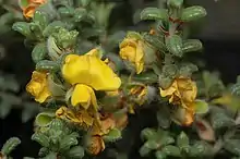 Pultenaea elachista is a rigid, erect, spindly shrub that typically grows to a height of 30–50 cm (12–20 in) high and has hairy branches. The leaves are arranged in opposite pairs, oblong to egg-shaped, 3–5 mm (0.12–0.20 in) long and 2–3 mm (0.079–0.118 in) wide and hairy when young. There is a point on the ends of the leaves, the edges are rolled under, there are lance-shaped stipules at the base and the lower surface is densely woolly-hairy. The flowers are arranged singly in small groups in leaf exils near the ends of short side branches and are about 8 mm (0.31 in) long and more or less sessile. The sepals are hairy, 8–9 mm (0.31–0.35 in) long with bracteoles at the base. The standard petal is yellow with red or orange markings, 9–9.5 mm (0.35–0.37 in) long and much longer than broad, the wings 8–8.5 mm (0.31–0.33 in) long and the keel 8.0–8.2 mm (0.31–0.32 in) long. Flowering occurs from July to December and the fruit is a hairy pod.[2][3]