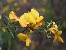 The flowers are 7–13 mm (0.28–0.51 in) long, arranged singly or in clusters, in leaf axils near the ends of short side-shoots with egg-shaped, tapering bracts 2 mm (0.079 in) long, each flower on a pedicel 2–3 mm (0.079–0.118 in) long. The sepals are 4–7 mm (0.16–0.28 in) long with lance-shaped bracteoles 1.5–3 mm (0.059–0.118 in) long at the base. The standard petal is yellow to orange with red striations, the wings yellow to orange and the keel yellow with a red tip or all red. Flowering occurs from October to November and the fruit is a hairy pod, the lower half enclosed with the remains of the sepals.[2][3][5]