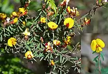 Pultenaea reflexifolia, commonly known as wombat bush-pea,[2] is a species of flowering plant in the family Fabaceae and is endemic to isolated parts of Victoria. It is an erect shrub with its foliage covered with tangled hairs, and has elliptic to narrow egg-shaped leaves with the narrower end towards the base, and yellow and red pea-like flowers arranged singly or in pairs on the ends of short side branches.