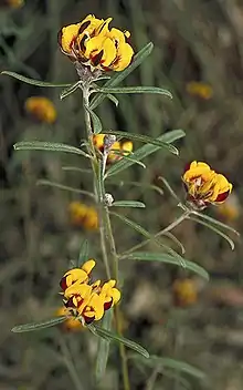Pultenaea rosmarinifolia, commonly known as rosemary bush-pea,[2] is a species of flowering plant in the family Fabaceae and is endemic to eastern New South Wales. It is an erect shrub with linear to elliptic leaves with the narrower end towards the base, and yellow and red to purplish flowers.