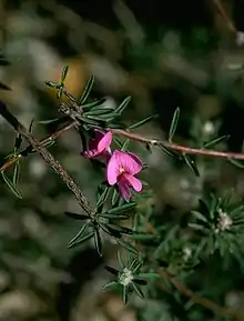 Pultenaea subalpina, commonly known as rosy bush-pea,[2] is a species of flowering plant in the family Fabaceae and is endemic to a restricted area of Victoria. It is a rigid, prostrate to erect or spreading shrub with linear leaves and pink, pea-like flowers.
