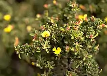 Pultenaea trifida, commonly known as Kangaroo Island bush-pea,[2] is a species of flowering plant in the family Fabaceae and is endemic to Kangaroo Island in South Australia. It is an erect to prostrate shrub with hairy branches, egg-shaped to more or less round leaves, and relatively few yellow to orange and red, pea-like flowers.