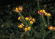 Pultenaea verruculosa is an erect shrub that typically grows to a height of 20–50 cm (7.9–19.7 in) and has hairy stems. The leaves are flat, 5–12 mm (0.20–0.47 in) long and 0.7–1 mm (0.028–0.039 in) wide with stipules 1.8–2.0 mm (0.071–0.079 in) long at the base. The flowers are yellow-orange with red markings, each flower on a hairy pedicel up to 1 mm (0.039 in) long with hairy bracteoles 5.0–5.6 mm (0.20–0.22 in) long attached to the pedicel. The sepals are hairy, 6–7 mm (0.24–0.28 in) long, the standard petal 13–15 mm (0.51–0.59 in) long, the wings 11–14 mm (0.43–0.55 in) long and the keel 9.6–11.5 mm (0.38–0.45 in) long. Flowering occurs from September to November and the fruit is a flattened pod.[2]