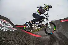 A pump track is a circuit of rollers,[lower-alpha 1] banked turns and features designed to be ridden completely by riders "pumping"—generating momentum by up and down body movements, instead of pedaling or pushing.[1] It was originally designed for the mountain bike and BMX scene, and now, due to concrete constructions, is also used by skateboard, and accessible to wheelchairs. Pump tracks are relatively simple to use and cheap to construct, and cater to a wide variety of rider skill levels.