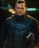 The Punisher appears in Punisher: War Zone, portrayed by Ray Stevenson. This version is a former Force Recon Marine who has operated as the Punisher for five years. After inadvertently killing an undercover FBI agent while assaulting a mob dinner, he attempts to atone for his mistake and threatens to quit vigilantism over his partner Microchip's protests. Amidst this, he must also contend with the FBI's "Punisher Task Force" and Billy "The Beaut" Russoti / Jigsaw, a survivor of the mob dinner who seeks to recruit an army to get revenge on Frank.[9]