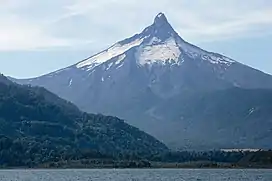 Puntiagudo-Cordón Cenizos (Spanish pronunciation: [puntjaˈɣuðo koɾˈðon seˈnisos]) is a snow-capped volcanic chain located in the Andes, in Los Lagos Region of Chile, near Volcán Osorno. It lies between Rupanco Lake and Todos los Santos Lake. "Volcán Puntiagudo" (Spanish for "Sharp-pointed volcano") is a stratovolcano with a prominent 2,493 m high sharp-pointed summit that results from glacial dissection and gets its name from this feature. According to locals, the Puntiagudo volcano lost some of its sharp point in the earthquake of 1960 (9.4–9.6 Mw). So the volcano was more pointed than it is today. Puntiagudo is also given the name Cerro Cenizas.