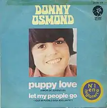 "Puppy Love" is a popular song written by Paul Anka in 1960 for Annette Funicello, a Mouseketeer, whom he had a crush on. Anka's version reached No. 2 on the Billboard Hot 100 behind Percy Faith's "Theme from A Summer Place",[1] No. 4 on the Canadian CHUM Charts,[2] and No. 33 on the UK Singles Chart.[3]