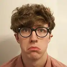 A puppy face or a puppy dog face is a facial expression that humans make that is based on canine expressions. In dogs and other animals, the look is expressed when the head is tilted down and the eyes are looking up. Usually, the animal looks like it is about to cry. This gesture is sometimes performed by children in order to persuade their parents to do something special for them. Humans often open their eyes a little wide, pinch and/or raise the eyebrows, and stick the bottom lip out, while tilting their entire head a little downward and looking upwards at the person to whom they have aimed the gesture. Often, the head is also tilted a little sideways.