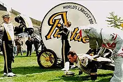 In 1907 the Purdue All-American Marching Band was the first marching band to break ranks and form a block letter on the field.[8] During the pregame show, the drum is positioned in the 'P' formed by the marching band and spins while the band plays "Hail Purdue!".