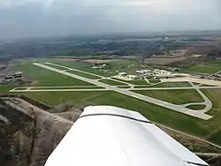 The airport covers an area of 527 acres (213 ha) at an elevation of 606 feet (185 m) above mean sea level. It has two asphalt paved runways: 10/28 is 6,600 by 150 feet (2,012 x 46 m) and 5/23 is 4,225 by 100 feet (1,288 x 30 m).[1]