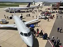 The airport has one passenger terminal, which was used for air service until early 2004 and has space for two airline gates. The building was built in 1943 as hangar-2, was renovated in 1979 to provide screening for airline passengers and again in 1984, including a new entrance, concourse, and baggage claim area.[25] It currently houses an aviation library and airport administration offices. Its functionality as an airline terminal is still regularly used for charters for Purdue Sports. A new terminal on the west side of the airfield was planned in the 1980s.[15] These plans were later altered to include a new terminal on the east side of the airfield in the early 2000s,[26] but neither of these plans ever came to fruition.