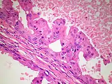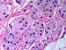 Pure apocrine carcinoma of the breast (PACB) is a rare carcinoma derived from the epithelial cells in the lactiferous ducts of the mammary gland.[1] The mammary gland is an apocrine gland.[2] Its lactiferous ducts have two layers of epithelial cells, a luminal layer which faces the duct's lumen (i.e. passageway) and a basal layer which lies beneath the luminal layer. There are at least 4 subtypes of epithelial cells in these ducts: luminal progenitor cells and luminal mature cells which reside in the luminal layer and mammary stem cells and basal cells which reside in the basal layer.[3] Examination of the genes expressed in PACB cancer cells indicate that most of these tumors consist of cells derived from luminal cells but a minority of these tumors consist of cells derived from basal cells.[4][5]