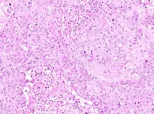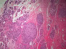 The microscopic histopathology of PACB tumors prepared with hematoxylin and eosin staining shows that >90% of the tumors consist of apocrine gland-like tissue. The lesions must also show that tumor cells have broken through their ducts of origin to invade adjacent tissue in at least one area. Most of the tumor cells (termed type A cells[15]) typically appear somewhat more irregular than normal apocrine gland cells. They have abundant eosinophilic (i.e. pink due to the uptake of the eosin dye) cytoplasm which contain numerous granules[11] and large mitochondria.[15] Their nuclei are large, variably sized and shaped, have multiple nucleoli (which are eosinophilic[11] and may be distinctively large in size[14]), and are surrounded by highly visible nuclear membranes. The cells are arranged into solid sheets, nests, papillae, and/or cords (see Figs. 1 and 2).[11] The tumor cells' cytoplasmic granules test positive when treated with the PAS diastase stain.[16] Binucleated cells, i.e. cells with two nuclei, are common.[10] Less commonly, type B apocrine cells are present; these cells have a more foamy and vacuolated cytoplasm (i.e. containing multiple vacuoles) than type A cells[15] and often resemble foamy histiocytes or sebaceous gland cells.[17] The tumor cells have low to moderate rates of proliferation based on their Ki-67 protein levels.[7] PACB tissues may have localized areas that contain mucin-like secretions within their luminal ducts,[10] localized areas of necrosis (i.e. foci containing dead or dying cells), and/or microcalcifications spotted throughout the apocrine tissue.[11] The stroma (i.e. connective tissue between the sheets, nests, papilla and cords of cells) typically contains non-malignant, infiltrating lymphocytes (see Fig. 3). In an examination of 41 PABC tumors, 33 (80.5%) had <50% of their stroma tissues infiltrated with these cells while 8 (19.5%) had ≥50% of their stroma tissues infiltrated with them. Tumors with ≥50% of their stroma infiltrated with lymphocytes tended to have carcinoma cells that had high rates of proliferation.[11] Metastatic and recurrent PACB tumors have a histopathology similar to their original primary tumors.[14]