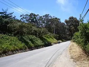 Some buildings still remained as late as the 1930s, but the town was largely abandoned before World War II.[6] The 1940 U.S. Geological Survey map shows a few buildings and notes the "Purisima School."[7] The 1943 map still shows the school. At that time, State Route 1 still passed directly through Purissima.[8] Today, Highway 1 runs farther west of the original route. Verde Road runs north from Lobitos to Purisima Creek Road; this is actually the original alignment of Highway 1.[9] According to the older maps, the school was located on the north side of what is now Verde Road, just east of Highway 1. The cemetery is in the woods bordered by Verde Road and Highway 1.