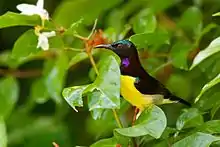 They pollinate the flowers of many plant species such as Bruguiera, Woodfordia, Hamelia and Sterculia.[18] They tend to perch while foraging for nectar and do not hover as much as the syntopic Loten's sunbird.[19] It has been noted that they maintain special scratching posts, where they get rid of pollen and nectar sticking to their head.[20] When the flowers are too deep to probe, they sometimes pierce the base of the flower and rob the nectar, an action termed as "nectar theft" since the flower's primary purpose of attracting pollinators is foiled.[21] They sometimes visit open crop fields and take honeydew exuded by leafhoppers.[22]
