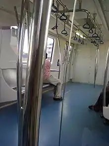 BMRC procured 150 metro coaches for fifty 3-car train sets in DMC-TC-DMC formation for Phase l of Namma Metro from BEML - Hyundai Rotem at a cost of ₹1,672.50 crore (₹16.72 billion).[59] Coach specifications were as follows: Dimensions: Length-20.8m, Width-2.88m, and Height-3.8m. Each coach has a seating capacity of about 50 and standing capacity of 306 (basis 8 per sqm). Thus, each train had a capacity of about 1000.[60] Traction was through four 180 kW motors in each motor coach. The trains have a maximum speed of 80 km/h and axle load of 15 tonnes. The trains operate on 750V DC with third rail bottom power collector system. Features include stainless steel body fully air-conditioned coaches, longitudinal bank of wide seats, wide vestibules between coaches, non-skid and non-slip floor surfaces, wi-fi enabled, four wide passenger access doors on each side, wide windows, automatic voice announcement system and electronic information and destination display system.
