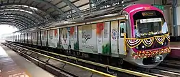 Initial operations on the Purple Line began with twenty-one 3-coach trains. As loads increased with increasing ridership, all trains were converted to six coaches.[61] The first six car train was introduced on the Purple Line on 23 June 2018.[62] The additional coaches were supplied by BEML at a cost of Rs 8.8 crore each.[63]
