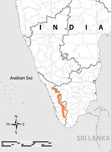 Earlier thought to be restricted to the south of the Palghat Gap in the Western Ghats, additional records have extended its known range farther north of the gap.[12][13] The species is now known to be quite widely distributed in the Western Ghats, ranging from the Camel's Hump Hill Range in the north, all the way to the northernmost portions of the Agasthyamalai Hill Range in the south.[7]