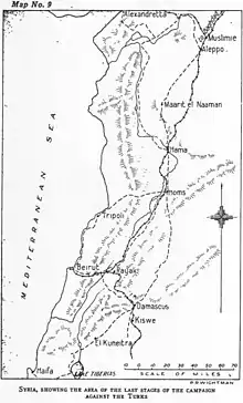 On 9 October Allenby issued orders for the speedy occupation of Tripoli by the 7th (Meerut) Division.[29] The town and the port of El Mina were strategically important because supplies could be unloading at the port and quickly transported inland to Homs on the main road to Aleppo. The capture of Tripoli would vastly improve the lines of communication supporting the pursuit.[26][30]