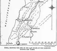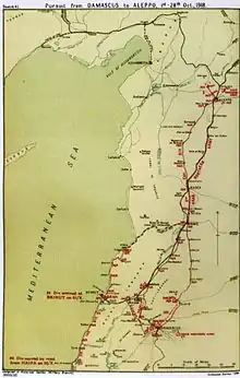 On 5 October the advance north was resumed although supply would be difficult.[38] Allenby anticipated capturing the ports of Beirut and Tripoli, which would improve supplying rations to Desert Mounted Corps. "Nevertheless his decision [to continue the pursuit] was born of rare ambition and resolution."[39] It would be a "bold move" as the British Empire troops would be well beyond range of support from the rest of the EEF.[40]