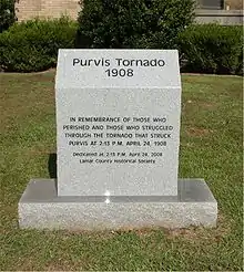 On April 24, 1908, three F4 (207-260 mph) tornadoes left a line of destruction from Livingston Parish, Louisiana northeast to Wayne County. This line of storms left 143 people dead, with 83 dead in Purvis alone. From the reports of Dr. H.R. Hermesch, Assistant Surgeon U.S. Navy and the Relief Committee at Purvis, we know that there were 83 dead, 340 wounded and 1935 destitute in the town of Purvis. The large "Town Clock" in the domed tower of the courthouse of the time, sustained damage from flying debris and was stopped at 2:13 in the afternoon.
