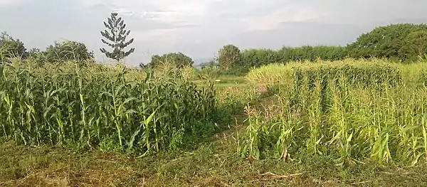 Push–pull technology is an intercropping strategy for controlling agricultural pests by using repellent "push" plants and trap "pull" plants.[1] For example, cereal crops like maize or sorghum are often infested by stem borers. Grasses planted around the perimeter of the crop attract and trap the pests, whereas other plants, like Desmodium, planted between the rows of maize, repel the pests and control the parasitic plant Striga. Push–pull technology was developed at the International Centre of Insect Physiology and Ecology (ICIPE) in Kenya in collaboration with Rothamsted Research, UK.[2] and national partners. This technology has been taught to smallholder farmers through collaborations with universities, NGOs and national research organizations.[3]
