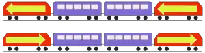In a push–pull train, locomotives at both ends of a train are used at the same time, being controlled by one driver.