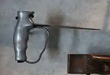 The New Orleans-style push dagger was known as the gimlet knife.[5] The gimlet knife had a short two-inch (50 mm) blade with a "gimlet" or T-handle.[5] It was a common weapon in the city during the 1800s and was usually slipped into a boot or concealed inside a coat sleeve or else hung on a waistcoat button by a strap attached to the knife's leather sheath.[8][5] The gimlet knife was used in so many riots, fights, and murders in New Orleans that the city passed an ordinance in 1879 prohibiting anyone within city limits from selling, offering or exhibiting such a weapon for sale.[9][10][5][6]