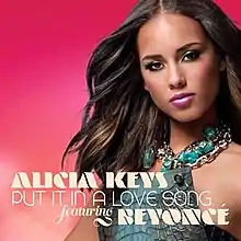 "Put It in a Love Song" is a song by American singer Alicia Keys. The song, written and produced by Keys and Swizz Beatz, features guest vocals by American singer Beyoncé. It was originally sent to radio on January 19, 2010, by J Records, as the fourth single from Keys' fourth studio album, The Element of Freedom (2009). However promotion for the song was halted so that Keys could release "Un-Thinkable (I'm Ready)" as her next single. "Put It in a Love Song" talks about a girl who just wants her lover to write her a song and prove to her he's worth her time.