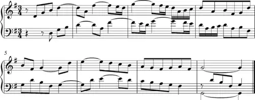 Both J. S. Bach and Handel featured canons in their works. The final variation of Handel's keyboard Chaconne in G major (HWV 442) is a canon in which the player's right hand is imitated at the distance of one beat, creating rhythmic ambiguity within the prevailing triple time: