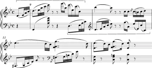 Antony Hopkins describes the above as "a delightfully naïve canon".[14] More sophisticated and varied in its treatment of intervals and harmonic implications is the canonic passage from the second movement of his Piano Sonata 28 in A major, Op. 101: