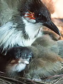 The breeding season is spread out and peaks from December to May in southern India and March to October in northern India.[29] Breeding may occur once or twice a year.[30] The courtship display of the male involves head bowing, spreading the tail and drooping wings.[30] The nest is cup-shaped, and is built on bushes, thatched walls or small trees. It is woven of fine twigs, roots, and grasses, and embellished with large objects such as bark strips, paper, or plastic bags.[23] Clutches typically contain two or three eggs.[30] Adults (possibly the female[15]) may feign injury to distract potential predators away from the nest.[30][31] The eggs have a pale mauve ground colour with speckles becoming blotches towards the broad end. Eggs measure 21 mm and are 16 mm wide.[32] Eggs take 12 days to hatch. Both parents take part in raising the young. Young birds are fed on caterpillars and insects which are replaced by fruits and berries as they mature.[15] The chicks are psilopaedic (having down only in the pterylae).[14] Eggs and chicks may be preyed on by the greater coucal and crows.[15]