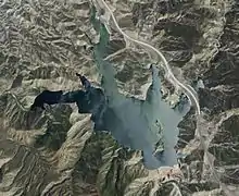 ![]() Satellite view of dam and reservoir. Interstate 5 is on the right of the image. | |