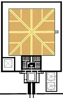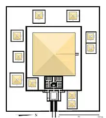 Surrounding the actual structure was a comparatively large complex, which consisted of a mortuary temple, a rectangular structure with a courtyard in the center, and nine smaller pyramids for Senusret's queens. From the mortuary, a limestone causeway with carved statues set every 10 cubits ran to a public temple outside the perimeter wall of the compound. Little of this is visible today, however, because later Roman buildings were built over the complex.[5]