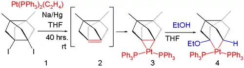 A reaction of the diiodide 5.1 in Figure 5 with sodium amalgam in the presence of ethylenebis(triphenylphosphine)platinum(0) does not give the intermediate alkene 5.2 but the platinum stabilized 5.3. The sigma bond in this compound is destroyed in reaction with ethanol.
