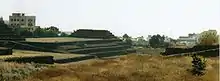 - A layer of thickness between 25 and 150 cm, composed out of small volcanic rocks, most likely put in place in one movement, which levelled the uneven stone underneath; the stones contained only very few finds, mostly a small number of pottery shards, of which some was local and some imported, both kinds were roughly estimated as belonging to the 19th century. The pyramids stand stratigraphically directly on top of this bottom layer, therefore allowing for an earliest date of construction of the pyramids within the 19th century.[7]