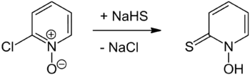 5NOS, chosen as an abbreviation of pyridinethione, and found in the Persian shallot.[4] It exists as a pair of tautomers, the major form being the thione 1-hydroxy-2(1H)-pyridinethione and the minor form being the thiol 2-mercaptopyridine N-oxide; it crystallises in the thione form.[5] It is usually prepared from either 2-bromopyridine,[1] 2-chloropyridine,[6][7] or 2-chloropyridine N-oxide,[8] and is commercially available as both the neutral compound and its sodium salt.[1] It is used to prepare zinc pyrithione,[9][10] which is used primarily to treat dandruff and seborrhoeic dermatitis in medicated shampoos,[11][12] though is also an anti-fouling agent in paints.[13]