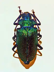 Pyrodes nitidus can reach a length of 30–40 millimetres (1.2–1.6 in). The basic coloration is metallic blue-green or purple-green. Pronotum and elytra are densely punctured, with a large ridge on each side of the thorax.